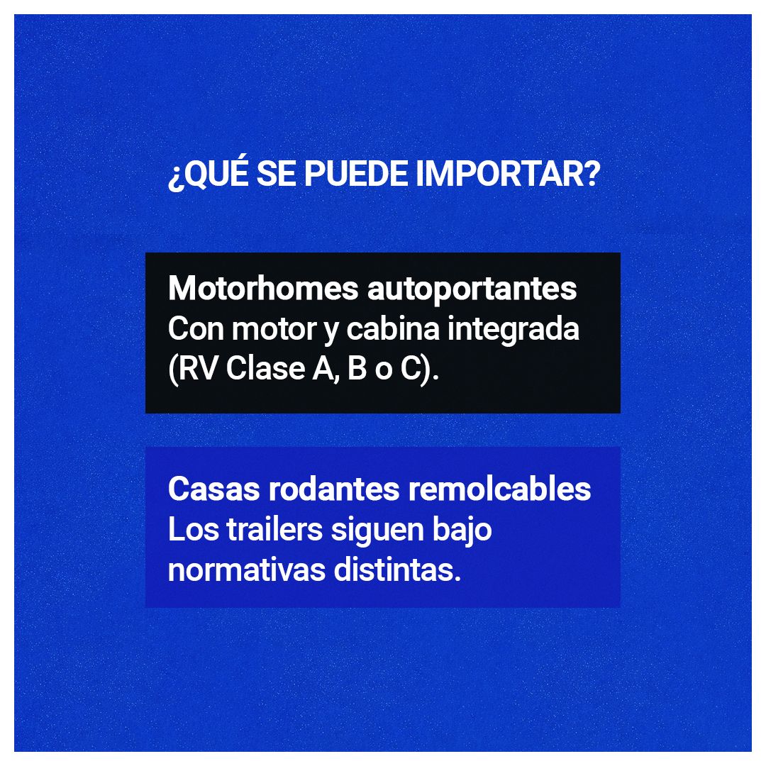 Casas rodantes remolcables (no habilitadas): Los trailers o remolques que necesitan un vehículo tractor para desplazarse continúan fuera de este régimen de importación. Para estos casos, existen normativas específicas de homologación y patentamiento local.