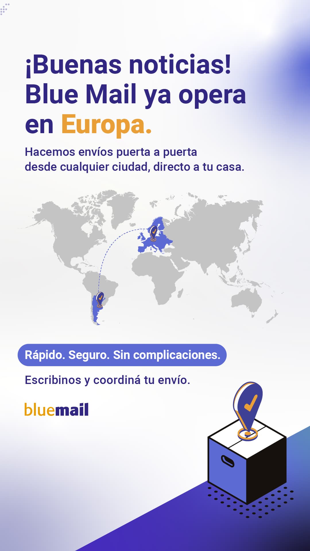 | Blue Mail Madrid | Europa | Nueva oficina europea ubicada en Calle del Arte, 16 – Local 3 / 28033 – Madrid. Ofrece operaciones aéreas y marítimas; conecta cualquier ciudad europea con cualquier ciudad argentina; enfoque en e‑commerce y pymes. |